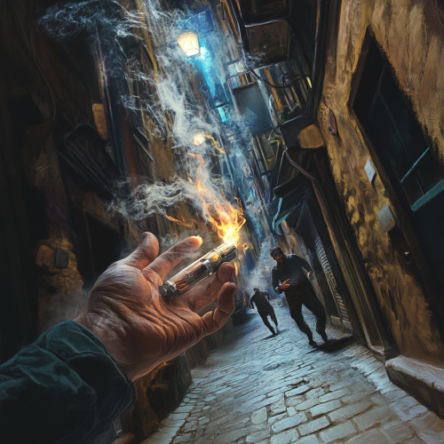 A marble and like comic marble image, fully details, image is a perspective view of a man who thinks the vape in his hand has turned into a stunner, while he tries to write by burning his arm, his writing and make a mark with burns, and he is in a narrow, dark alley. , at the end of the alley and at the final point of the shadow perspective, two men are seen running towards him, hyper-realistic, 4d. We can see a specific mark by burning on his arm.