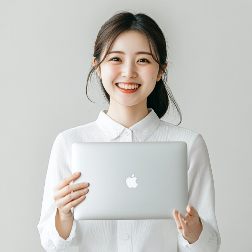A simple 30-year-old Japanese woman holding a Mac computer, smiling with an eye on the future. Various scenes such as her talking, laughing, smiling, pointing, and thinking