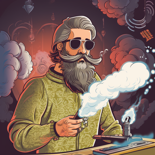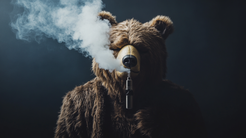 a human body with a bear head mask, closely resembling smokey the bear of the web3 project berachain, smoking a vape pen. the human body / bear head is smoking a vape pen. he has closed eyes and is deeply disappoined with the world.