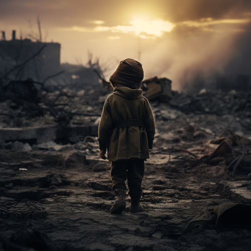 destroyed city, explosions every where, houses destroyed, flowers are dead, one arab boy dressed in pajama, torn clothes holding a peace flower looking with sad eyes, make it realistic