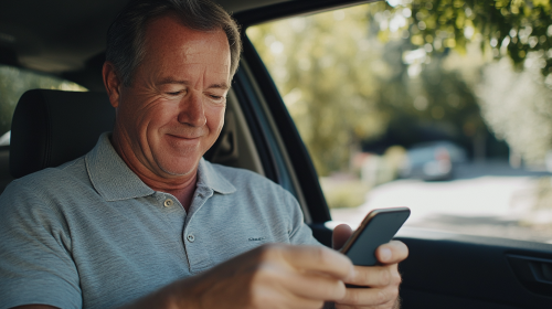 close-up man smiling and in the background an empty warehouse with boxes in different parts and a car in the center, night light emulating a Canon EF 24-70 mm f/2.8 L II USM camera, eye level perspective --ar 3:2 --s 250 --v 6.0