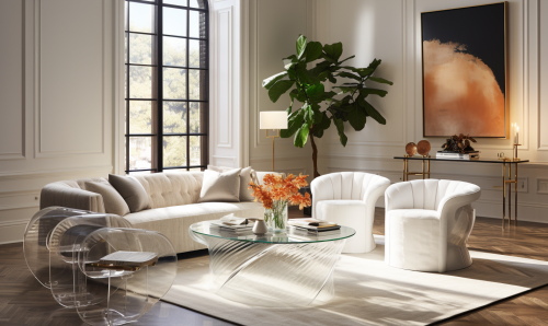Kelly Wearstler style living room interior with glass coffee table clear acrylic chair and glass vase, 3D corona render, --ar 5:3 --style raw --s 250