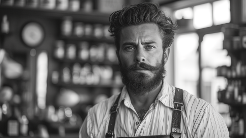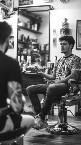 a wide shot of a young male barber sitting on a stool clippers, speaking to the camera. in the backgound, there is a man sat in a barber chair, StoryBoard Style, Black and White, Skitch --ar 9:16