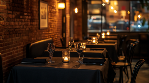 a 4k high resolution interior design rendering of a cozy modern dark interior of a restaurant dining room with a tall ceiling, warm candlelight warms chandeliere fixtures, dark wanlut wood wall moldings, dark seafoam blue banquettes, and dining tables for two with one dining armchair on one side, and the banquette on the other side
