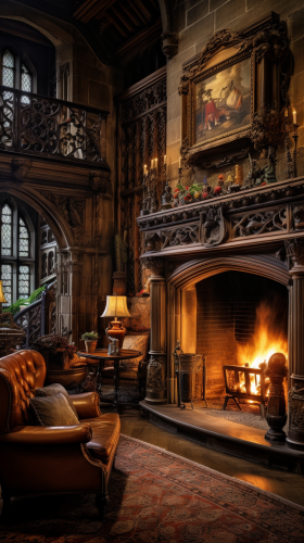 a very cosy scene of the interior of an Elizabethan castle with fireplace --ar 9:16
