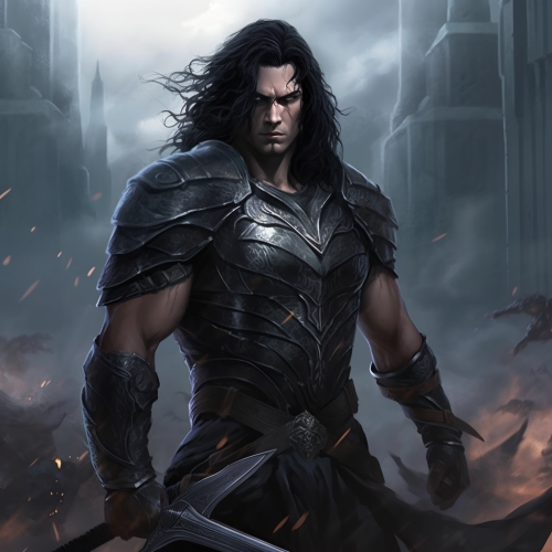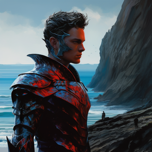 2 red big thorn sticking out from the sides of his hehlmet, a young handsome face Blue armored warrior is on a seacliff overseeing the island of dark evil