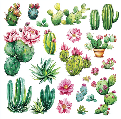 various watercolor cactus flower and leaf stickers are shown, in the style of guido borelli da caluso, baroque animals, sketchfab, western zhou dynasty, white background, magali villeneuve, landscape inspirations --ar 93:91