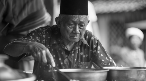 mid shot, dynamic angle, outdoor, Malay man in late 40s, wearing malay outfit, scoops porridge with ladle in hand, mosque food drive, singapore --ar 16:9