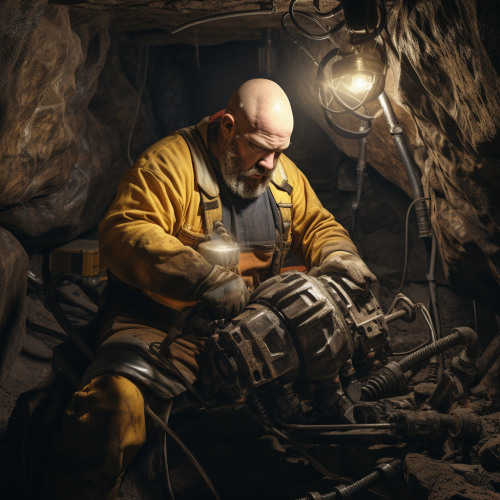 huge bald man working in mine drilling for metal ore with a big handheld drill