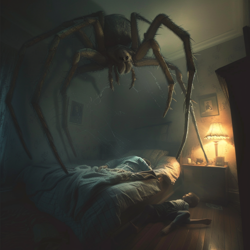 photo a bedroom, a child lying in bed looking at a giant spider in the room, looking affraid.