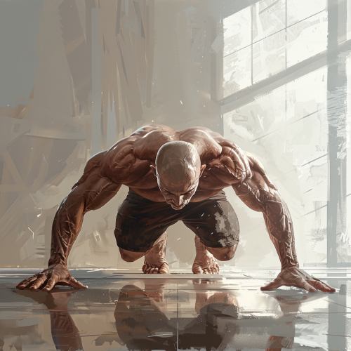 Generate a hyper-realistic image of an athlete in the middle of a push-up exercise. Focus on showcasing the correct form, with emphasis on the arm and core muscles. The background should be a minimalist gym setting, with soft, natural lighting to highlight the figure. The color scheme should be muted to keep the focus on the action.