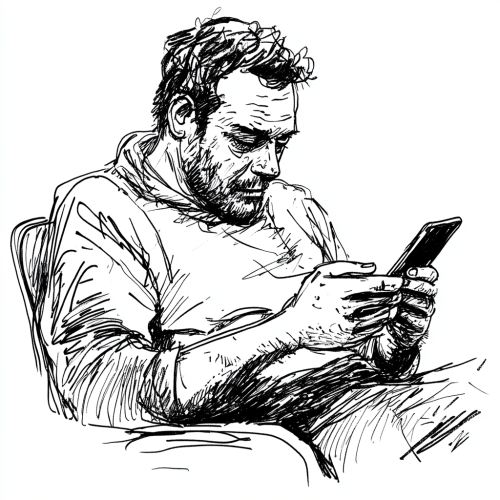 ink and pen illustration of a man enjoying morning coffee, and reading on his cellphone. nice ambient setting, clean isolated background --v 6.1 --s 50