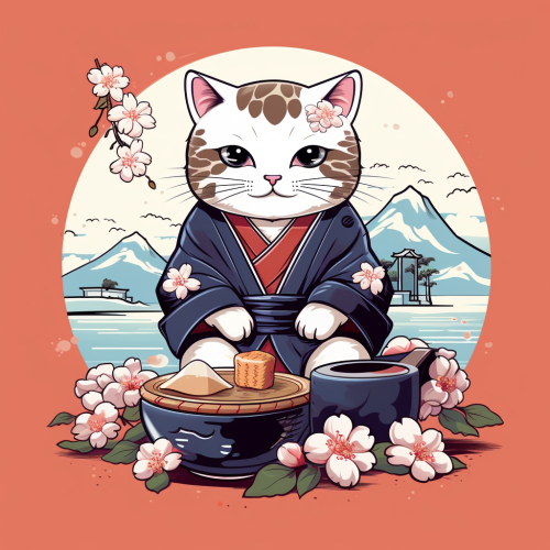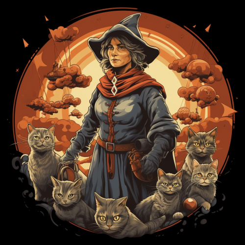 a T-shirt featuring the image of a group of 8 cat friends sitting at a picnic table of food, and they each look like one of the following: a half-asian male cat with a short beard, red-headed male cat with a full beard, a male cat wearing a baseball cap with a full beard, a female cat wearing a bow in her hair and small pouty lips, a half-asian female cat with glasses, a half-asian female cat reading a book who has an apple in front of her on the table, a female cat wearing a police uniform, and a male cat in gym shorts who is laying down on the ground with his legs crossed, in the style of a colorful 90s children's book, --ar 16:9