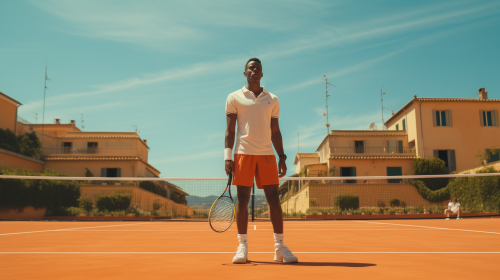 a wide shot of a black tennis player serving on a clay tennies court. sunny day. Wes anderson style. shot on 35 mm film. anamorphic lenses. cinematic. --ar 16:9