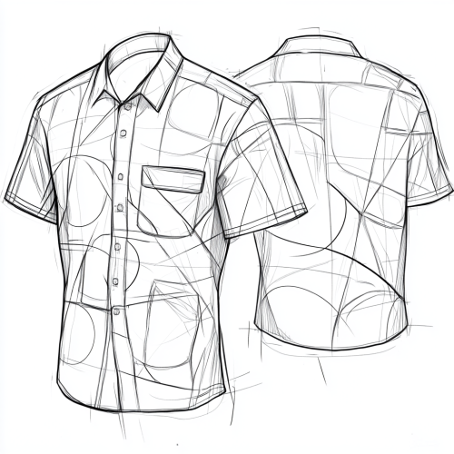 Create an illustration of a short-sleeve shirt design with both front and back views, similar to a technical flat drawing. The shirt should feature a large abstract round and square pattern with intersecting lines and visible stitching details. Ensure that the entire shirt is shown clearly, including both sleeves on the front and back views, without any parts getting cut off. The illustration should be centered with a clear white border around it to ensure all edges of the shirt are visible. The background should be plain white to provide a clean and unobstructed view of the shirt designs.
