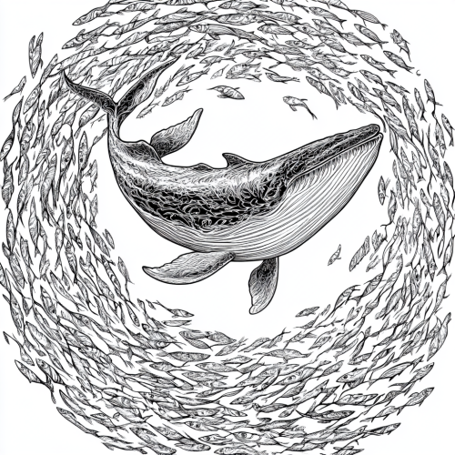 In American animated films. Blue whale. Only one whale is shown in the center. In the sea. A school of sardines is in a swirl on the left. Coloring pattern. Black and white.