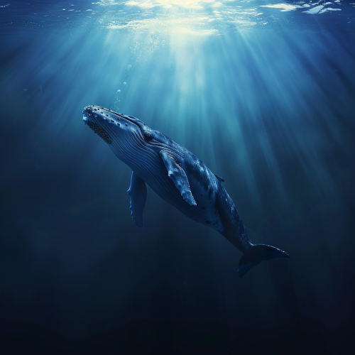 Create a big whale swimming in the blue ocean, make it realistic, aesthetic, cinematic and beautiful. Descripton also includes technical details of photographic shoot, such as the use of a Sigma Art 14mm f/1.8lens, a sertting of ISO 3200, an aperture of f/1.8--ar 4:5--stylize 250--v 6.0