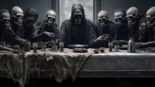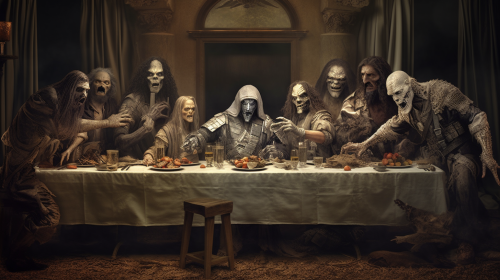 "Last Supper" with all the well-known horror film characters. , hyper realistic, super detailed, dynamic pose, photography, , 3d, concept art, magical --ar 16:9 --c 40 --s 400 --v 5.1 --style raw