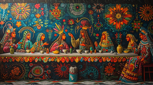 The Last Supper in the style of Huichol art, psychedelic poster, intricate details --ar 16:9 --s 250 --c 5 --v 6.0