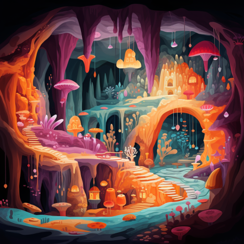**coloring page, bold lines, whimsical and playful illustration line drawing ink of Dr suess theme of caves inside a bold black circle border with white background,