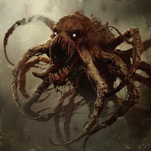 llustration, ink on paper, of a fantasy occult trading card of a lovecraftian creature with many eyes and symbiote like body. with a backdrop of damp cave in the art style of Graham Ingels, Mike Mignola, centered, psychedelic colors, vintage, --ar 3:4 --v 6.0 --s 75