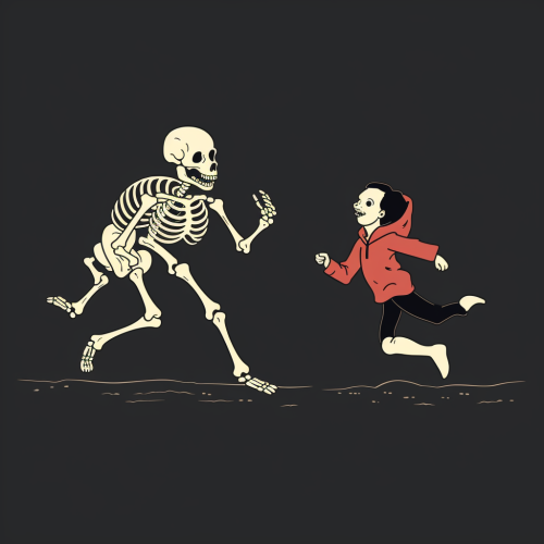dog chasing a human skeleton, cartoon style, flat colors, vector illustration, black and white, minimalist v4