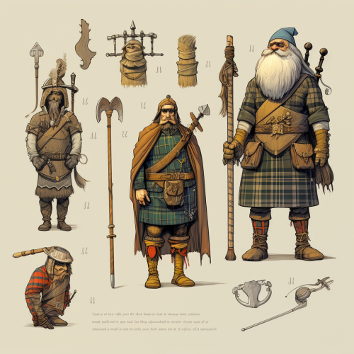 orthographic drawings of prop designs of a highland games athletic equipment, caber, weight for distance, hammer throw, sheaf toss, stone throw, from 11th century Scotland in graphic novel style of Studio Ghibli