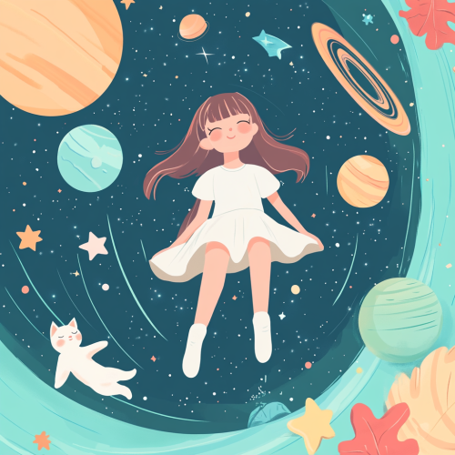 A cute girl floating in space, surrounded by stars and planets. The style is cartoon anime with a pastel color palette. A cute cat is also floating nearby. The overall atmosphere is playful and whimsical.