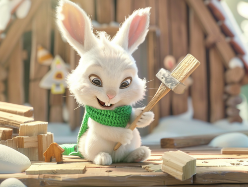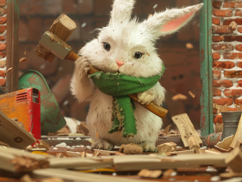A fluffy white rabbit wearing a green scarf, a cartoon character is holding a hammer to hammer a nail into a broken house, many animals holding wood, holding hammers to help build a house. --ar 4:3 --v 6.0