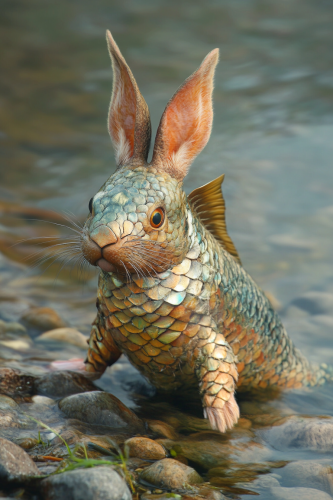 a realitic photo of a hybrid between a salmon and a rabbit. the salmon has shiny scales and the rabbit a fluffy fur and long ears. the hybrid should feature human body. --ar 2:3 --style raw --v 6.1
