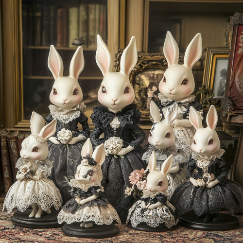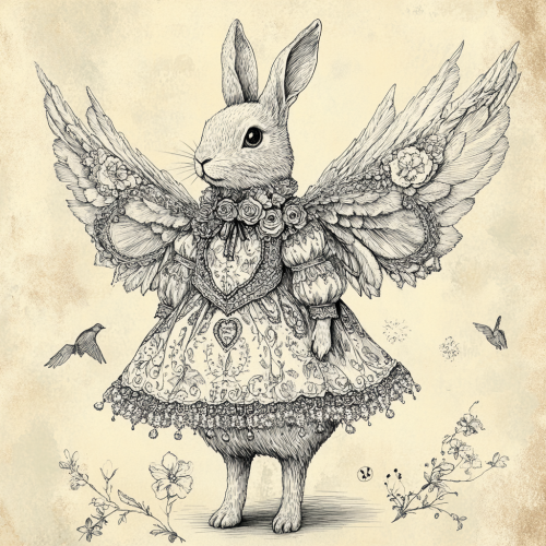 Create an Edward Gorey-inspired illustration of a standing rabbit adorned in a lavish Victorian-style garment with delicate embroidered patterns and fantastical wings. Use meticulous cross-hatching to craft the rabbit’s fur, adding depth and texture that evokes a sense of antique illustration. Render the intricate details of the outfit--the ornate trims, embroidered floral patterns, and layered textures--with fine, precise linework, emphasizing elegance and whimsy. Depict the rabbit with an expressionless face, characteristic of Gorey’s emotionally neutral figures. Ensure the proportions remain slightly stylized, evoking both fantasy and nostalgia. Keep the background minimal, using subtle abstract floral elements to reinforce an air of quiet magic. Introduce symbolic motifs, such as a small antique clock hidden among the details or a perched bird in the background, hinting at an underlying narrative of time, nature, or destiny. Maintain a muted, slightly desaturated color palette with occasional warm accents to evoke both charm and melancholy.