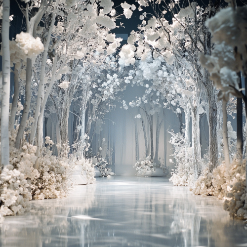 " The stage should feature a forest setting with white tree trunks and branches, and a white, reflective floor. Incorporate soft, diffused white lighting to create an ethereal atmosphere, with focused spotlights on the runway and models. Add white floral arrangements and artificial white flowers throughout the stage, with large, sculptural pieces as focal points. Use various textures and depth with draped white fabrics and hanging white branches. Frame the runway with white floral arrangements or frosted foliage, and consider projection mapping with subtle, moving visuals like falling snow. Include an ambient soundscape with gentle forest sounds to enhance the immersive experience.