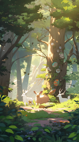 Whimsical forest with animals, fairies, dragonflies, trees, flowers.