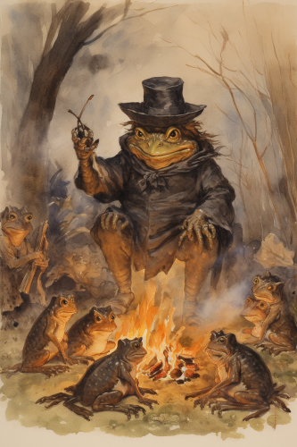 Water color vintage an evil frog and toad style, over the garden wall style, Evil sinister Frog with sitting by a fire in a coat Surrounded by baby frogs A Vintage water colour party invitation for a Forest folklore/ fairy tale, watercolour, Automn, cottagecore, folksy and cozy, early 1900's Australian harvest season, Over the garden wall, Frog party invitation, frog and toad style, Frog Wearing 1900's clothes sitting by a fire at his pond frog party, under the moon --ar 2:3