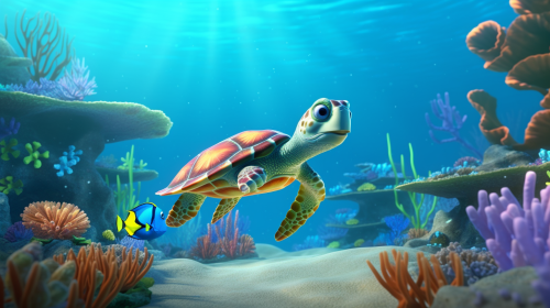 3d animation, a beautiful cartoon underwater, turtle, blue scene with fishes in center, in the style of three , 4k, high details --ar 16:9 --v 5.2