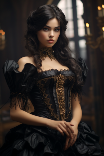 Create a surreal illustration inspired by Edward Gorey’s style, focusing on an elegant figure in a Victorian-inspired lace gown. The figure should stand poised with a calm, distant expression, evoking both mystery and detachment. Use detailed cross-hatching to bring out the intricate texture of the lace and the fine waves in the character’s hair, emphasizing depth and shadow through meticulous linework. The character should have slightly exaggerated proportions to enhance the surreal atmosphere, and the overall composition should convey elegance with a subtle sense of eeriness. The background should remain minimal, perhaps hinting at blurred architectural details to provide context without overpowering the subject. Introduce symbolic motifs like a small bird perched quietly nearby or a winding staircase fading into the shadows, reinforcing themes of isolation and longing. Balance elegance with the unsettling quiet characteristic of Gorey's storytelling.