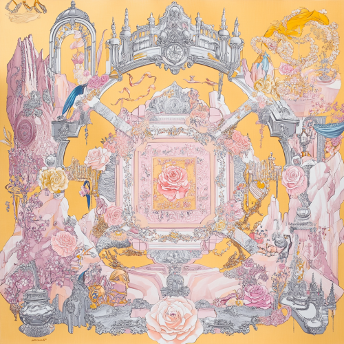 Hermès scarf design with a rose garden, a chinoiserie-patterned border framing the central square, an intricate labyrinth of silver and gold trim, ornate archways, antique clockwork details, lemon soft pastel hues, delicate floral motifs, surrounded by whimsical elements, a soft pink and lavender color palette, on a dominant lemon
