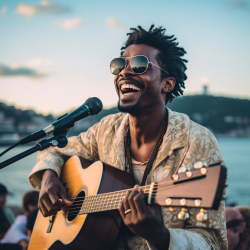apresentacao musicao do artista Seu jorge com um clima acustico intimista com poucas pessoas o local da apresentacao e o cristo redentor no rio de janeiro