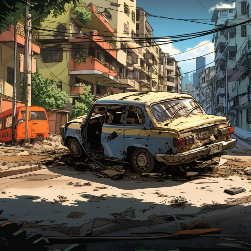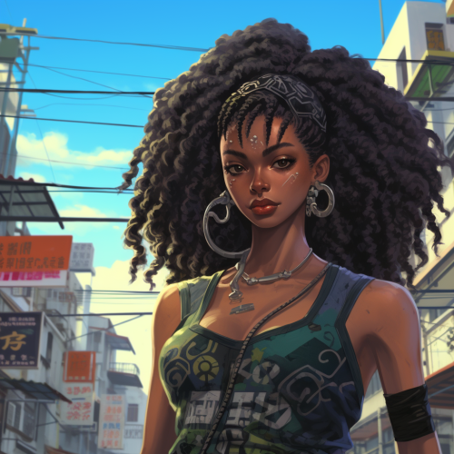 An anime comicbook illustration of a half Japanese and half black woman with curly . The setting is a cyberpunk, post-apocalyptic, futuristic Rio de Janeiro.