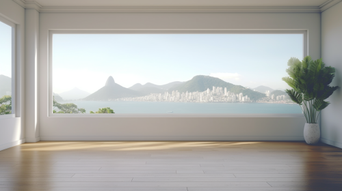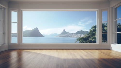 Empty blank living room,diagonal window, vista para o pao de açucar, rio de janeiro, realistic, 4k --ar 16:9
