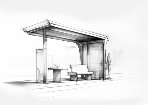 Product design sketch of an ergonomic bus stop, bus stop designed for clear information, black and white, --v 5.2 --ar 7:5