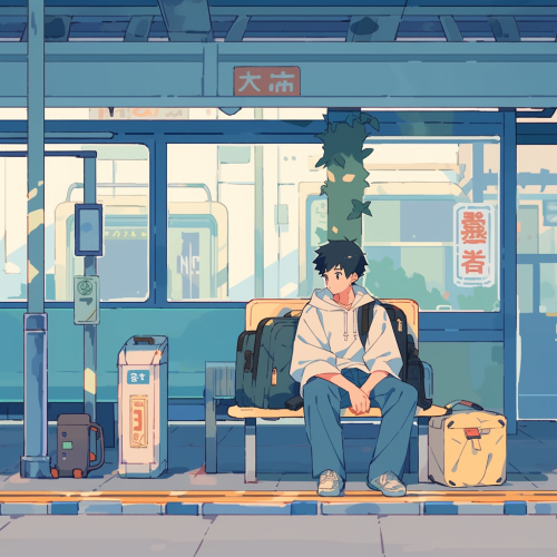 A girl waiting at a bus stop in Tokyo, looking around curiously with her back to us, in the style of anime, flat color illustration, street view of busy streets and buildings, traffic lights, street lamps, reflections on glass windows, light rain falling from the sky, high resolution, high quality, high detail, sharp focus, studio photo, intricate details, highly detailed, digital painting, artstation, concept art, smooth, sharp focus, bokeh background --ar 4:5 --niji 5