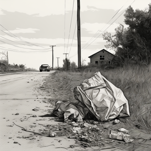 Black and white illustration in the style of the 1980s without much detail. An overturned empty square-paperbag on the side of the road.