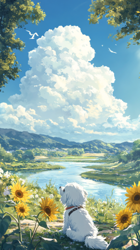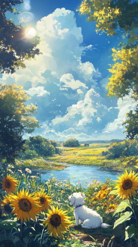 A white cute dog is leisurely spending time by a beautiful river in the Japanese countryside during the daytime. The sun is shining brightly in the sky, creating a peaceful and picturesque atmosphere. Sunflowers are in the foreground, adding a vibrant touch to the scene. The scene is depicted in Makoto Shinkai's anime style, with intricate details and vivid, beautiful colors. The scene feels dreamlike, with a calm yet powerful energy. --ar 9:16 --v 6.1