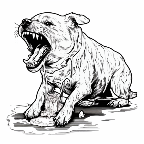 anime dog biting down on a chunk of meat. side angle, art style of One Piece, black and white Line art