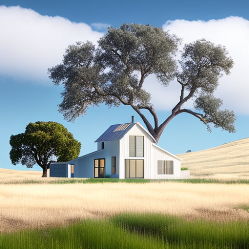 modern farmhouse on sloping field amongst oak tree hills of the San Francisco Bay Area during midday at a 3/4 angle facing left --upbeta --v 4 --s 750