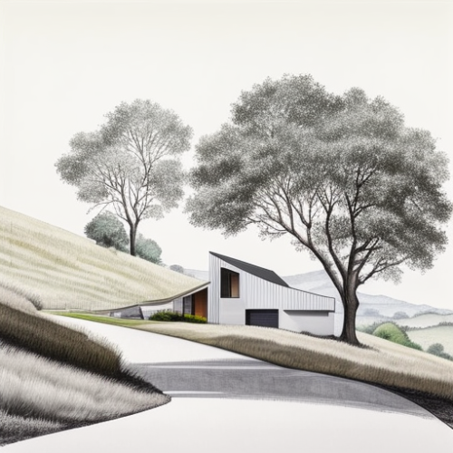 modern white board and baton farmhouse in the style of Aidlin Darling on sloping field amongst oak tree hills of the San Francisco Bay Area during midday with driveway extending from house to a road at a 3/4 angle --upbeta --v 4 --s 750