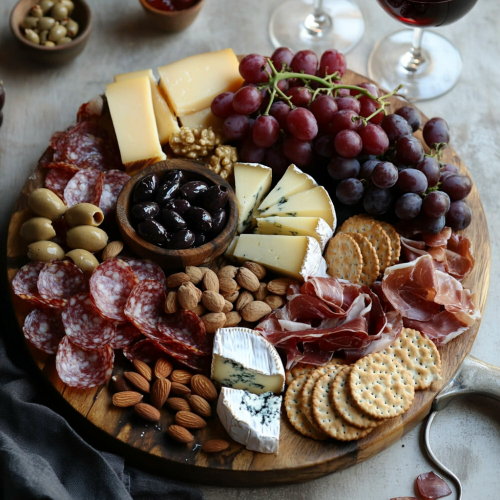 A rustic, elegant charcuterie board filled with an assortment of cheeses, cured meats, fresh fruits, nuts, and crackers. The board features creamy brie, slices of aged parmesan, blue cheese, and rounds of soft goat cheese. Surrounding the cheese are sliced baguette, salted almonds, walnuts, olives, thinly sliced prosciutto, salami, and clusters of red grapes. A small dish of honey and a bowl of flaky sea salt add a refined touch. The charcuterie board is arranged on a round wooden board with a handle, placed on a light background with a dark cloth napkin nearby. Two wine glasses, one filled with red wine, sit close to the board, adding warmth and sophistication