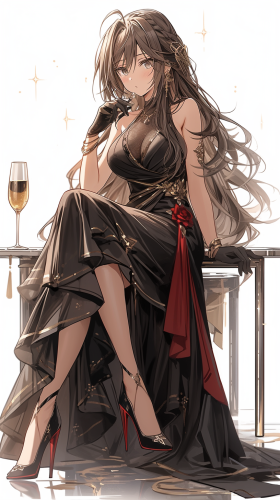 Full body, simple and slim fitting dress, semi transparent high slit skirt, high heels, holding a wine glass, elegant posture, queen temperament, momentum, black and gold color matching, white background --ar 9:16 --s 750 --niji 5