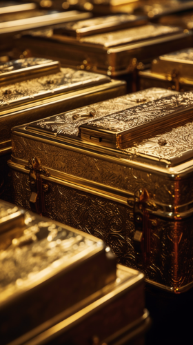 Gold and gold-plated funeral casket,Captured with a Canon EOS 5D Mark IV DSLR camera, EF 85mm f/1.4L IS USM lens, boasting a resolution of 30.4 megapixels, ISO sensitivity of 100, and a shutter speed of 1/125 second. --ar 9:16 --v 5.1 --style raw --s 750